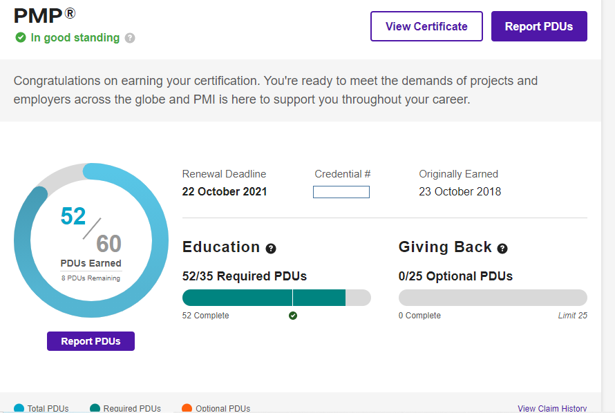 자격증을 갱신하기 위해서는 3년 동안 60PDU를 취득하고 갱신에 따른 150$+15$, 총165$(TAX)를 지불해야 합니다.