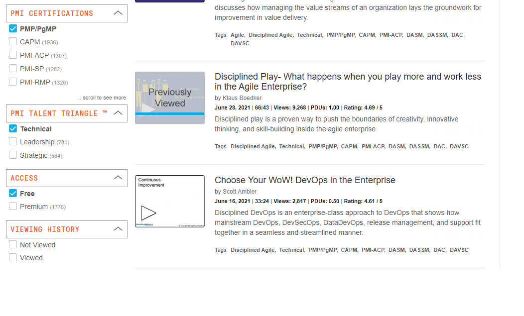 PMI 사이트 가입하신 아이디로 로그인을 하시면 왼쪽 하단에 FILTER 기능을 통해서 무료 강의를 선택할 수 있습니다.