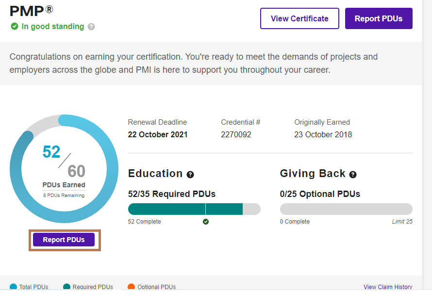 위와 마찬가지로 https://my.pmi.org/ 로그인 - Report PDUs 버튼을 클릭합니다.